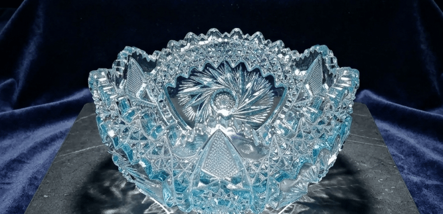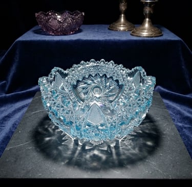 The Allure of the “Pinwheel” Bowl: A Vintage Treasure Worth a Second Look There’s something undeniably captivating about glass that tells a story—and this beautiful “Pinwheel” bowl does exactly that. At first glance, its shimmering ice-blue hue and intricate design evoke the elegance of high-end cut crystal from the American Brilliant Period. But look a little closer, and you’ll discover the charm of a different, equally fascinating chapter in glassmaking history. The star of the show is the mesmerizing Pinwheel pattern, radiating outward with precision-cut “vanes” that catch and reflect light from every angle. At its heart lies a delicate Brunswick-style star, giving the piece a sense of motion—as if it’s gently spinning even when still. Turn the bowl slightly, and you’ll notice the subtle honeycomb pattern nestled at the base, a classic detail often used in early 20th-century “near-cut” glass to mimic more expensive crystal. Rather than being hand-cut, this bowl was expertly crafted using pressed glass techniques—making it more accessible at the time while still delivering that luxurious look. The smooth, slightly rounded edges and molded base are telltale signs of its factory origins, likely from notable makers such as Imperial Glass or later reproductions by L.G. Wright. Dating somewhere between the early 1900s and mid-century, this piece bridges elegance and practicality. Whether used as a centerpiece, a serving bowl, or simply displayed to catch the light, it brings vintage charm into any space. Condition: Good to fair vintage condition, with signs of age that only add to its authenticity and character. For collectors and lovers of vintage glass alike, this “Pinwheel” bowl offers timeless beauty—without the high-end crystal price tag. A perfect blend of craftsmanship, history, and style.