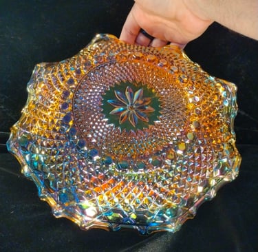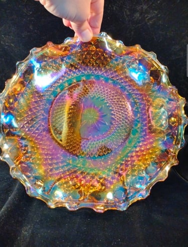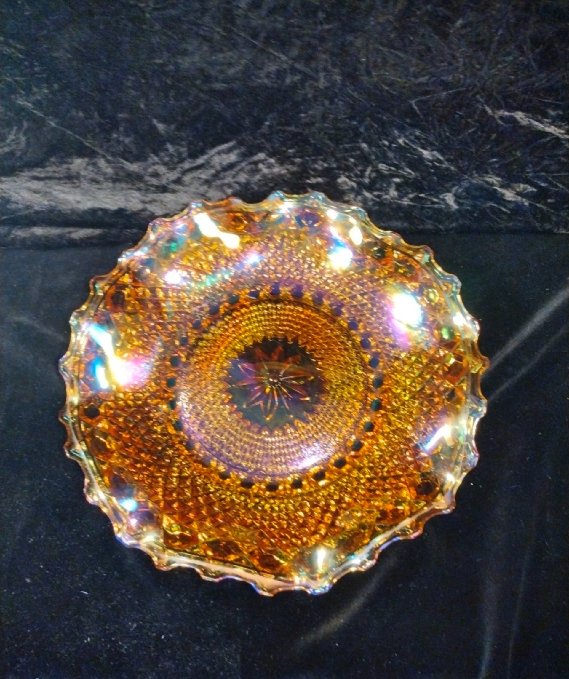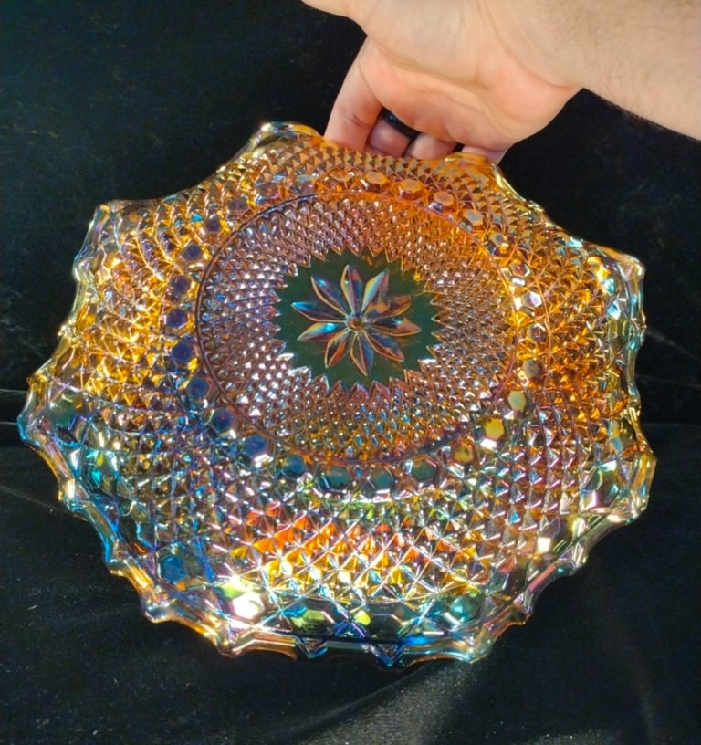 There’s something undeniably captivating about a piece of Marigold Carnival Glass—that radiant, oil-slick shimmer that dances across its surface like captured sunlight. For collectors and glass enthusiasts alike, this isn’t just a plate—it’s a story pressed into form and fired into brilliance. At the heart of this piece lies a striking geometric design—an 8-pointed star bursting outward into a textured mesh that catches and fractures light from every angle. Often described as “hammered,” this effect is actually the result of precision mold pressing, a technique that allowed early glassmakers to achieve intricate detail at scale. But what truly elevates it is the iridescent finish—metallic salts fused to the surface while the glass was still molten, creating that signature rainbow glow we now associate with Carnival Glass. Its roots trace back to the early 1900s, when American glasshouses like Fenton Art Glass, Imperial Glass Company, and Northwood Glass Company revolutionized decorative glass. Between 1907 and the 1920s, these pieces were often given away at fairs and midways—earning the nickname “Carnival Glass.” Yet despite its humble distribution, it was anything but ordinary. Designed to emulate the luxurious iridescence of Tiffany Studios glass, it brought a touch of opulence into everyday homes. What makes Marigold the most iconic color is its warmth—a golden amber base kissed with fiery hues of orange, pink, and violet. Each piece varies slightly, making every example a unique expression of chemistry and craftsmanship. And that scalloped edge? A subtle flourish that speaks to the artistry of the era—where even mass-produced items carried elegance. Today, Carnival Glass stands as a testament to early 20th-century innovation—where industry met artistry, and beauty was made accessible. For collectors, it’s not just about the glow—it’s about preserving a moment in time when glassmakers turned molten sand into magic.
