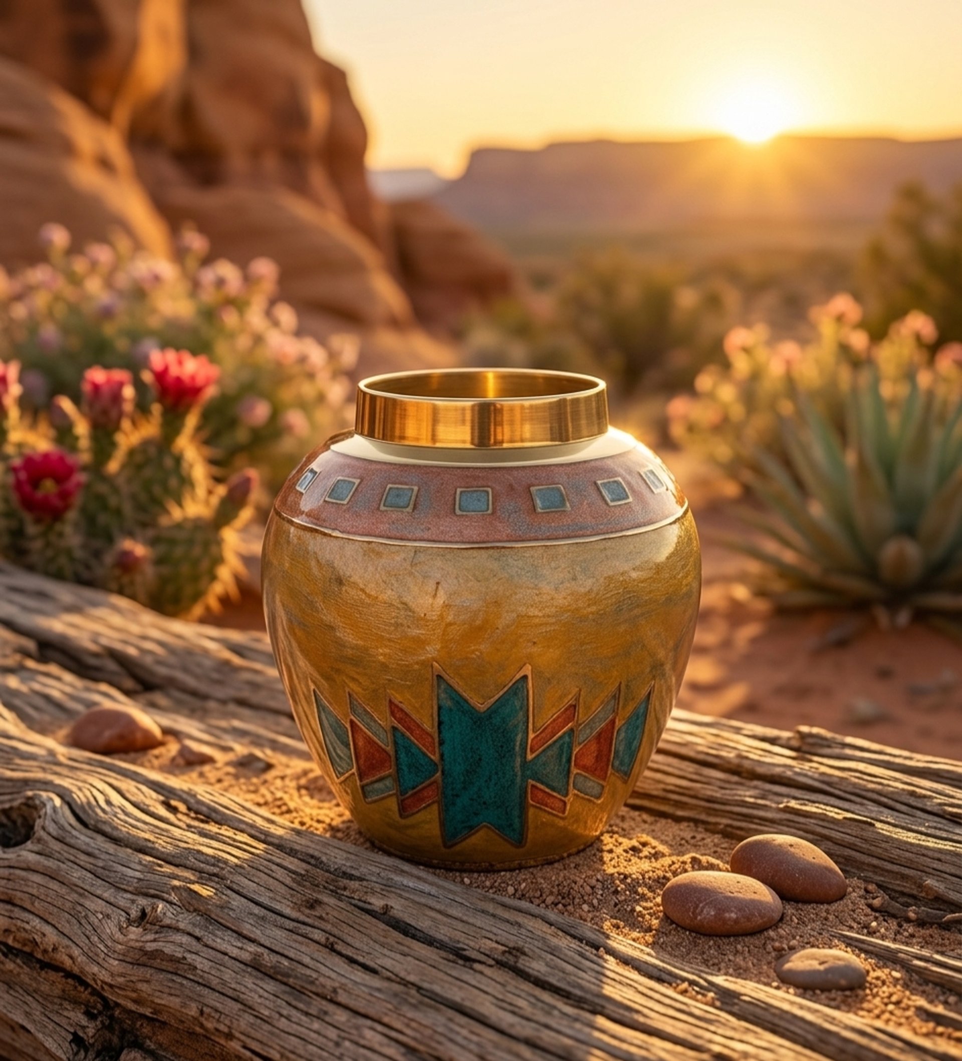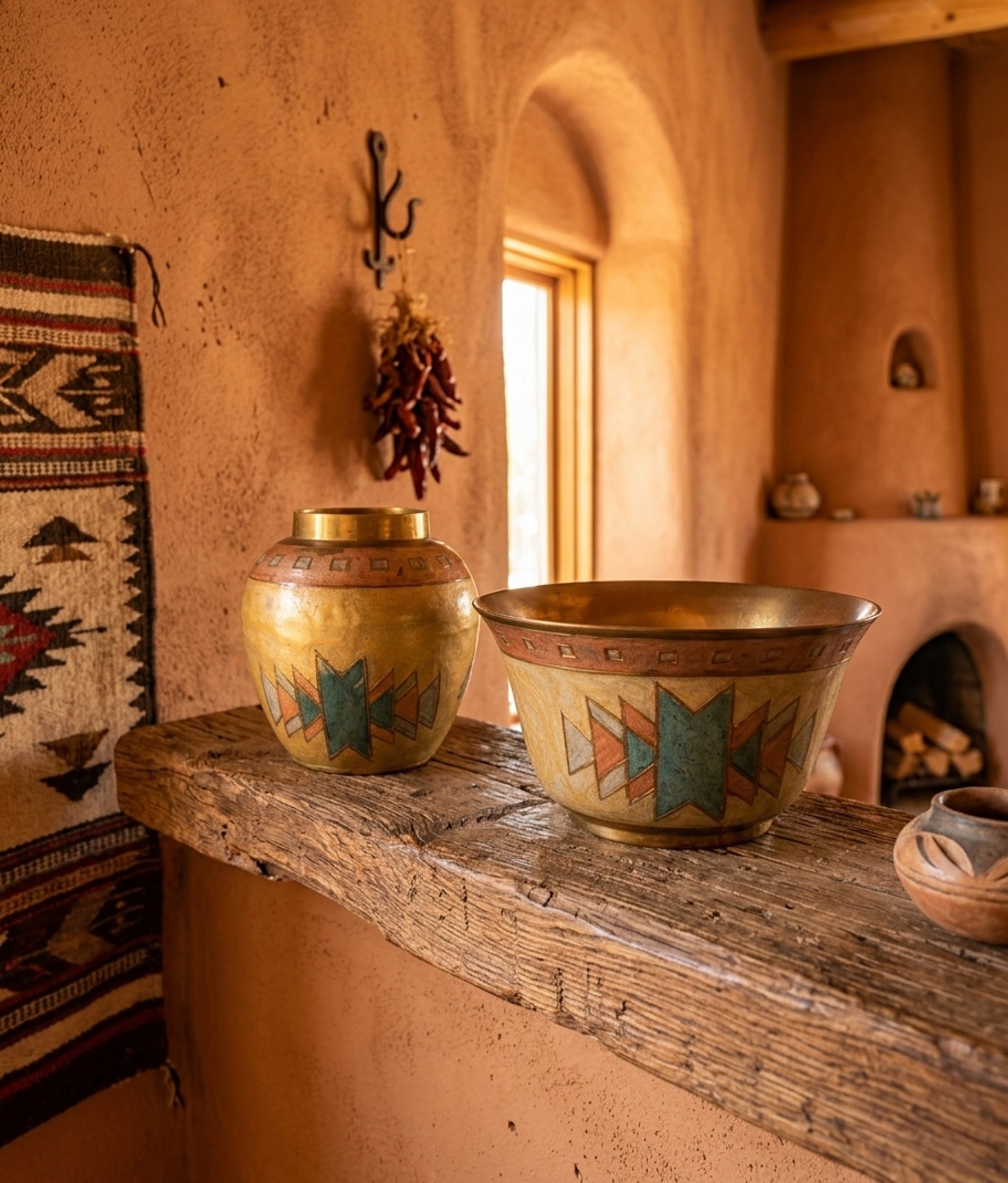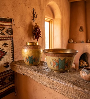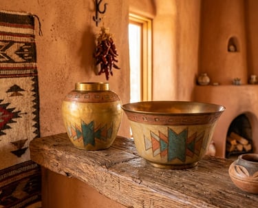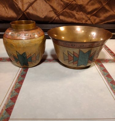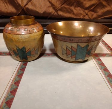 There is a specific, undeniable feeling when you pick up a piece of true vintage craftsmanship. It isn’t just the texture—it’s the gravity. Our latest discovery at Retro Reverie is a matching mid-century duo that demands to be felt. At a surprising 15 ounces, the bud vase carries the substantial heft of solid, sand-cast brass, a hallmark of 1970s Indian artisanship. This isn't the hollow, mass-produced metal of today; it is a dense, soulful pair that has journeyed through decades to find its way here. The Art of the Champlevé Look closely at the geometric "story" etched into the surface. This is the art of Champlevé enamel. Artisans hand-carve "cells" directly into the heavy brass, filling them with rich turquoise and terracotta pigments before firing them to a glass-like finish. The result is a vibrant, Southwestern-inspired motif that feels both ancient and modern. Restored with Reverence We believe in "perfectly imperfect" history. These pieces have been recently curated and gently restored to their finest display condition. While time has left a few tiny "flea-bite" chips in the enamel—whispers of the lives they’ve lived—we have meticulously cleaned the raw brass to reveal its original golden warmth. We chose not to over-polish, preserving the authentic patina that proves these are true relics of the boho-chic era. They stand now as a coordinated set, ready to bring their "Desert Sun" energy to a new mantle or vanity. The Details: Material: Solid Sand-Cast Brass (15 oz weight). Technique: Hand-etched Champlevé Enamel. Condition: Recently restored; gently aged with authentic vintage character. Own a piece of the weight of history. This matching set is now available for its next chapter.